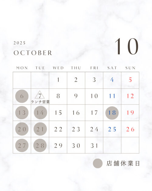 2025年9月25日 10月の定休日のご案内です 毎週月曜日、火曜日が定休日となります。 7日火曜日はランチのみ営業 18日土曜日は臨時休業させていただきます。 ご予約お待ちしております! リストランテ西山